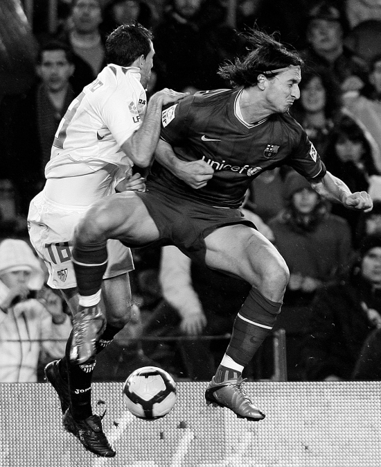 1月6日,巴塞罗那队在西班牙国王杯八分之一决赛首回合比赛中,主场以1:2不敌塞维利亚队。图为伊布(右)与纳瓦罗拼抢。 新华社发