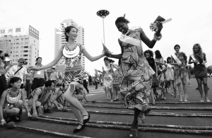 | 佳丽们与黎族少女一起跳竹竿舞。