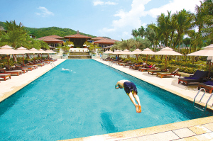 | 万宁石梅湾艾美度假酒店,来自马来西亚的游客纵身跃入泳池瞬间。 本报记者 张杰 摄 |