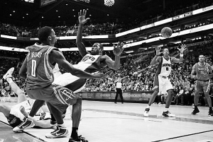 | 火箭队布鲁克斯(左)突破分球。 小新发 |