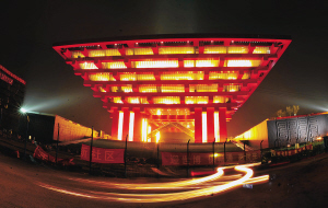 上海世博会园区建设目前进入全面冲刺阶段,园区内场馆建设临近尾声,装修布展全面启动。“一轴四馆”永久建筑中,主题馆、世博中心已竣工,中国馆、世博轴、演艺中心即将竣工,42个外国自建馆中,70%已开始装修和布展。图为中国馆。 新华社发