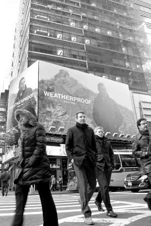 白宫要求制作方撤掉广告 1月7日,在美国纽约时报广场,行人从一幅以美国总统奥巴马的照片为素材的大型广告牌下走过。1月6日,美国一家名为Weather Proof的服装公司将奥巴马总统去年11月访华期间游览长城时的一张照片制作成户外广告,悬挂于时报广场。服装公司称,照片中的奥巴马身穿Weather Proof品牌的大衣。而白宫方面说,这家公司并未获得授权使用总统肖像,要求制作方撤掉广告。新华社记者 刘欣 摄