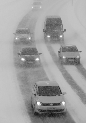 1月7日,在芬兰南部地区,车辆在雪中行驶。 当天,芬兰南部地区出现暴风雪天气,严重影响该地区的公路交通,造成多起撞车事故。在首都赫尔辛基地区,部分短途列车被取消,长途列车晚点。芬兰全国的气温也达到入冬以来的最低点,最北部地区的气温降至零下36.7摄氏度。 新华社记者 赵长春 摄
