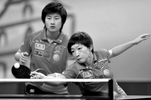 丁宁/刘诗雯(右)在比赛中。 新华社发
