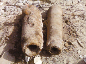 | ↑ 近日在三亚市南边海渡口出土的两门铁炮。 冯辉进 摄 |