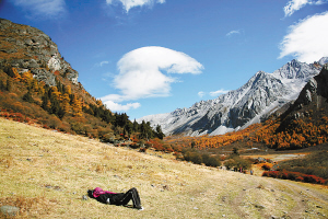 不能留恋了,前面的路还很长。从冲古寺到洛绒牛场要走两个多小时。金秋的灿烂扑面而来,天堂的感觉一点点展现。远远的金字塔状雪白的央迈勇山也清晰可见,走近神山,前面有开阔的金黄草甸,近景是小河流水,几朵懒散的白云在山间飘着,这就是“香格里拉”,梦中的天堂。此时感觉到的是心的亮敞、纯净。
