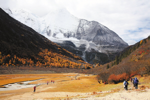 冲古寺背靠仙乃日(海拔6032米),正对夏诺多吉(海拔5958米),仙乃日是藏语,即“观音菩萨”之意,夏诺多吉意为“金刚手菩萨”之意,再往前是南峰央迈勇(海拔5958米),意为“文殊菩萨”之意。小路蜿延曲折地向上延伸着,绿色的灌木,黄色的树林,白色的瀑布,还有雪山、阳光、蓝天、白云,美妙的景色不断映入眼帘。走近,慢慢地靠近,雪山让人感到的是壮观、震撼、伟大。夕阳的余晖涂洒在夏诺多吉雪山顶上,雪山被染成炫目的金色,这就是日落金山了。