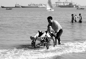 | 10日上午10时,在假日海滩,来自山西运城的残障少年周新烨第一次看到了大海,开心得欢叫起来。这一天,假日海滩被评为国家4A景区。 本报记者 王军 摄 |