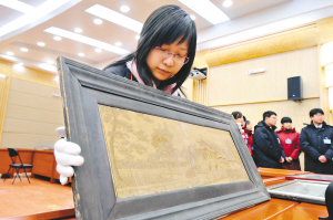1月11日,工作人员展示织锦颐和园图。 当日,北京颐和园喜获2824件清朝至民国时期的珍贵历史资料,包括清朝至民国时期价值近百万元的颐和园游记、颐和园游园新闻报道、颐和园清漪园被焚后的老照片、颐和园老明信片等,为人们了解这一皇家园林的历史变迁提供了珍贵的资料。 新华社发(郑永 摄)