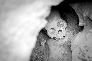 | 1月11日在埃及新发现的金字塔建造者墓穴中的一个头骨。 新华社发