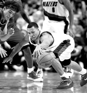 | 11日,在NBA常规赛中,骑士队客场以106比94战胜开拓者队。图为开拓者队球员罗伊在比赛中拼抢。 新华社发 |