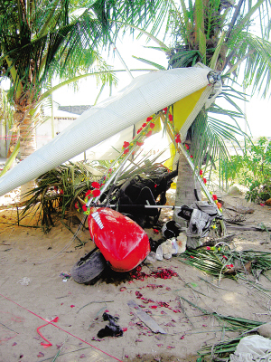 今天上午8点30分许,澳大利亚籍男子RODNEY驾驶滑翔机为一婚礼助兴时发生了意外———滑翔机在崖城保港盐灶村进行低空飞行时撞上了路边的椰子树后坠落。记者接到报料后赶到现场看到,机身为红色的滑翔机倾斜靠在一棵椰子树上,滑翔机的座舱内除了一双男士拖鞋和一双女式鞋外,一只布娃娃也血迹斑斑;两个头盔掉在地上,机身周围还散落着不少红色的花瓣;滑翔机的动力伞已经破损,机身出现裂痕,仪表也已脱落。