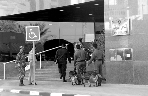 1月11日,在科威特首都科威特城,警察带领警犬进入科威特证券交易所大楼进行调查。 当日,一匿名电话称,科威特证券交易所大楼受到炸弹威胁。警方随后紧急疏散大楼内部人员并封锁了大楼。警方对大楼进行调查和搜索后证实,此次炸弹威胁为虚假情报。 新华社发(诺法勒·易卜拉欣摄)