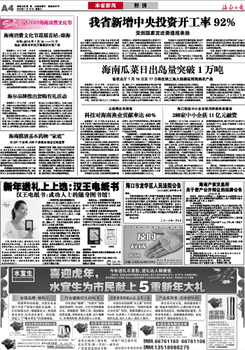 海南日报 本省新闻经 济 004 2010-01-131 2010年01月13日 星期三