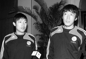 今晚,省文体厅在海口皇冠假日酒店为即将出征亚洲杯预选赛的国足举行壮行宴会。壮行会结束后,国足两位队长曲波和杜威愉快地接受了记者的采访。
