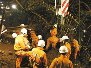 1月12日,贵州省福泉市利森水泥厂一处工地脚手架突然倒塌,造成8人死亡,2人受伤。伤者随即被送到医院救治,目前无生命危险,消防官兵在事故现场实施救援。 新华社发