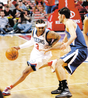 | 16日,在NBA常规赛中,76人队主场以98:86战胜国王队。图为76人队球员艾弗森(左)在比赛中带球突破。 新华社发 |