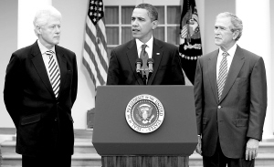1月16日,美国总统奥巴马(中)和两位前总统克林顿(左)、小布什(右)在白宫出席新闻发布会。奥巴马已经邀请两位前任一同参与海地救援工作。
