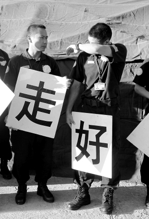 在海地太子港,两名中国驻海地维和部队官兵在营地为战友送行。