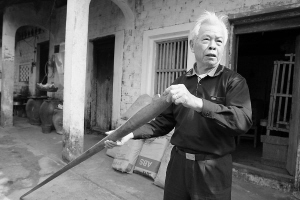 | 黄守钵展示黄学校当年所用摇船木橹。 |
