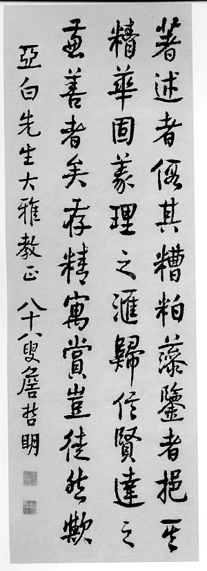 詹氏书法流派由詹哲明(1878-1971)和其前辈首开先河。出生于晚清的詹哲明,历晚清经民国,又由近代走进当代,94高龄谢世,可以说,在他的身上,凝聚了中国书法的一个世纪,颇具有启迪意义。詹哲明先生青年时期曾执教于广东澄海、汕头一带,后赴新加坡、泰国,并在泰国曼谷创办汉文学校,执教20余年。青年时期正处于民族内忧外患时代的詹哲明,胸中有激情,有豪气,但在战事连连的乱世中,一介书生能有多少作为?先生晚年息影家园四十秋,寄情砚边,笔歌墨舞,写下许多诗文及书帖、册页,摈繁华于往昔,养朴拙于当今,表现出一个文人于纷繁的世间无奈与清醒自知的情绪。林岫评价说,詹哲明的作品“兼取颜真卿与何绍基的自然行笔而为一体,不同于当时当地其他书家的流行书风,必是他长年不鹜交际、简居养拙的结果”。