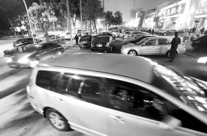 晚上6:30,记者来到金龙路实地查看,发现人行道上已经停了两排车,中间只余两米多宽的间距。晚上7时,从海口市公安局到“东郊椰林”酒店,600多米长的金龙路两侧排成了汽车长阵。
