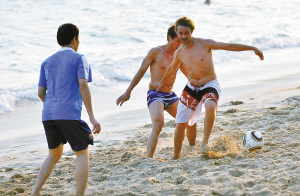 外国游客在三亚市大东海的沙滩上踢足球(1月16日摄)。