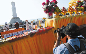 1月17日,来自法国国家地理杂志的摄影师尼古拉斯和伊卡扎比耶在三亚南山景区采风,拍摄展示热带海洋风光和佛教文化的图片。