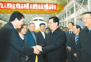 | 1月14日至17日,中共中央总书记、国家主席、中央军委主席胡锦涛在上海市考察工作。这是胡锦涛在承担大型客机总装任务的中国商飞上海飞机制造有限公司考察时,勉励企业员工发扬科学求实精神,让中国人自主研制的大型客机早日飞上蓝天。