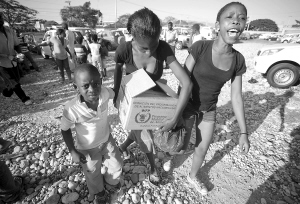 1月17日,几名海地人在太子港领取援助物资后离开。当天,更多援助物资运抵海地。 新华社发(戴维摄)