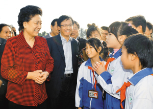 | 1月17日,中共中央政治局委员、国务委员刘延东和陵水黎族自治县思源实验学校的学生亲切交谈。 本报记者 宋国强 摄 |