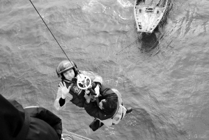 | 1月17日,通过绞车作业,救生员将遇险渔民救上直升飞机。 李军升 摄