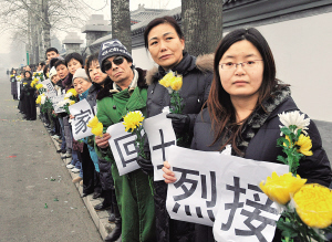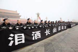 伴随着哀婉的乐声,8位烈士的灵柩在怀抱亲人遗像的亲属护送下,由礼兵缓缓抬放上灵车。周永康等领导同志目送灵车离去。