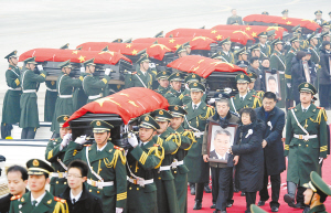 上午10时40分许,载着8位烈士灵柩的专机徐徐滑到停机坪上。覆盖着中华人民共和国国旗的烈士灵柩由80名礼兵缓缓抬下专机,迎接的人群中不时发出难以抑制的抽泣声。