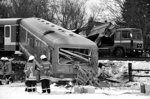 1月20日,在德国下萨克森州布伦瑞克附近,救援人员在撞车事故现场工作。当天,布伦瑞克南部一铁路道口发生列车和货运汽车相撞事故,造成至少12人受伤,其中2人伤势严重。事故还造成这列由萨尔茨吉特开往布伦瑞克的区间列车大量柴油泄漏。 新华社/法新