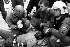 | 一月十九日,在海地首都太子港,俄罗斯救援队员救助地震幸存者皮埃尔·龙尼。