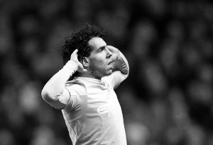 1月20日,在英格兰联赛杯半决赛首回合比赛中,曼城队以2比1战胜曼联队。图为独中两元的曼城队球员特维斯庆祝进球。 新华社发