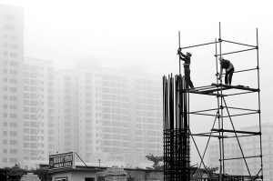 | 1月20日,在海口市凤翔路上,工人们正在大雾中施工,不远处的高楼掩映在大雾之中。 本报记者 张杰 摄 |