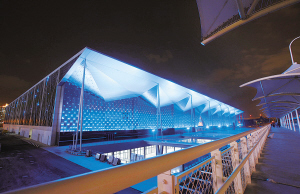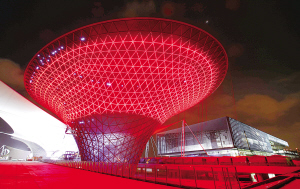 1月21日,世博主题馆正在进行外墙灯光调试。