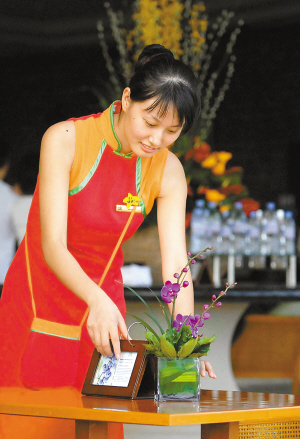 | 1月20日,三亚万豪度假酒店服务员身着新设计的服装正在酒店内摆设本地花卉。为迎接博鳌国际旅游论坛召开,作为接待酒店之一的万豪酒店早早就进行全方位训练、准备。本报记者 苏建强 摄 |