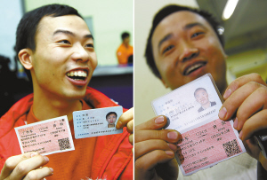 | 1月21日,外来务工人员李建刚(右图)和他表弟刘超(左图)通过电话订票买到广州至资阳的实名制火车票。 新华社发 |