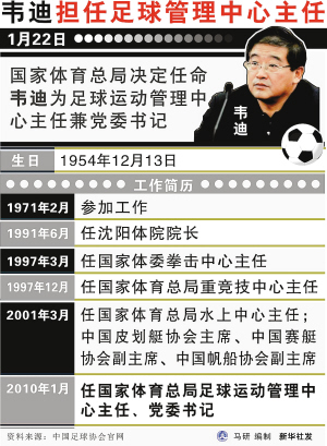 新华社北京1月22日电(记者郑道锦 杨明)中国足球的管理层22日发生重大人事变动,原国家体育总局足球运动管理中心主任、党委书记南勇,副主任杨一民被免去职务,原水上运动管理中心主任韦迪接替南勇成为足管中心新主任、党委书记。
