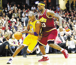 | 1月22日,在NBA常规赛中,骑士队主场以93比87战胜湖人队。图为詹姆斯(右)防守科比。 新华社发 |