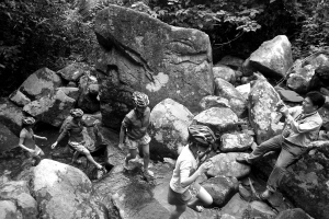 | 一批来自内地的游客,在呀诺达雨林景区的山涧溪流中游玩。 本报记者 苏晓杰 摄 |