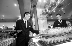 ↑ 1月24日,金海岸罗顿大酒店,服务人员正在仔细摆放杯具。今年“两会”上,金海岸罗顿大酒店成为省政协委员的新驻地。 本报记者 宋国强 特约记者 吴可义 摄