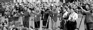 ↑会前,媒体记者在细心调整机器设备,为报道好两会做好准备。 本报记者 张杰 摄