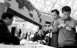 ↑1月24日,海口寰岛泰得大酒店,来自东方市江边乡的基层省人大代表陈玉光(右一)报到。 本报记者 李英挺 摄