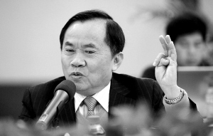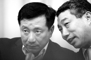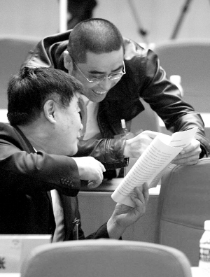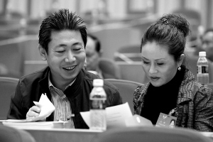 | ↑在会议开始之前,潘超委员(左)与民盟的王佳委员(右)在讨论国际旅游岛建设中关于人才引进的提案。 本报记者 张杰 摄