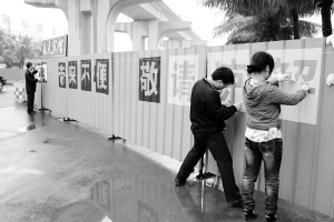 | ←工人们冒雨在南海大道的围栏上贴致歉、提示标语。 本报记者 古月 摄