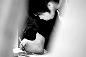 1月25日,刘凯健用右脚握笔,参加素描考试。 当日,2010年江苏省外普通高校艺术类专业招生考试(美术类)南通考点迎来一名特殊的考生———刘凯健。刘凯健目前就读于江苏省启东市大江中学,2002年,年仅11岁的刘凯健因触电事故失去双臂和左腿。此后,他凭借顽强的毅力乐观面对生活,不仅学会了用脚穿衣、吃饭,还继续求学,以脚代手开始了崭新的人生。在此次美术考试期间,南通考点为他开通了考试绿色通道,安排专人照顾他,帮他顺利完成考试。 新华社发